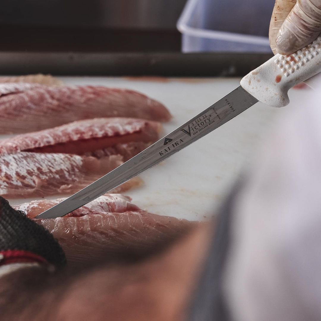Essential for any angler, the filleting knife features a slim, flexible blade that easily navigates around small fish bones, ensuring clean cuts and maximum yield. While it shares some similarities with the boning knife, the filleting knife’s longer and slimmer design makes it particularly suited for precise filleting tasks.