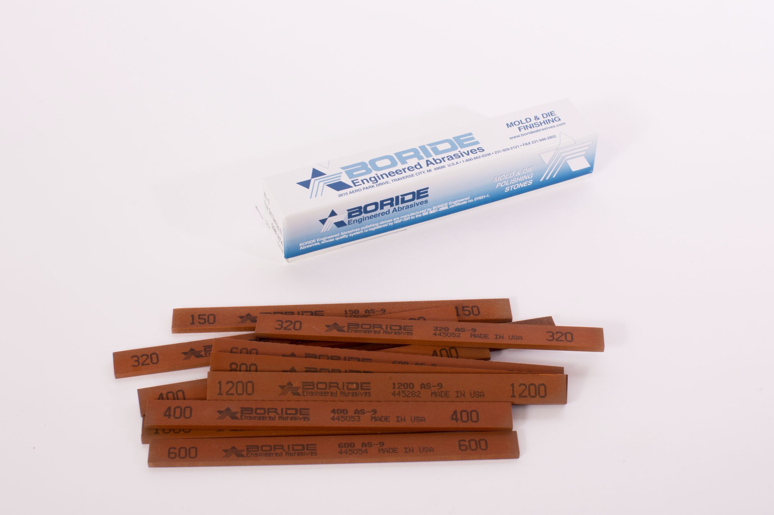 AS-9 320 EDM Polishing Stone: crafted with aluminum oxide for moderate breakdown. Perfect for hand stoning EDM scale surfaces and mold/die steels. Soft enough for quick breakdown, ideal for shaping tools. Offers fast, smooth cutting action.