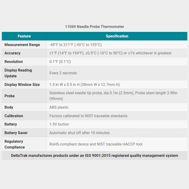 The Needle Probe Thermometer features a reduced tip that is ideal for measuring temperature of “thin mass” foods such as meat patties, chicken and fish fillets per the FDA Food Code 4-302.12(B). The thermometer is designed and constructed under exacting standards to meet and exceed specifications required for commercial and professional uses.