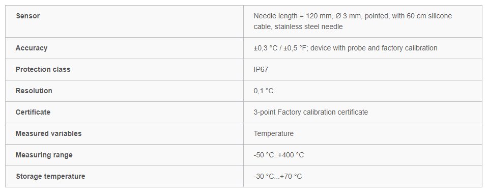 • Pointed probe with 60 cm silicone cable and grip, needle length = 120 mm, Ø 3mm