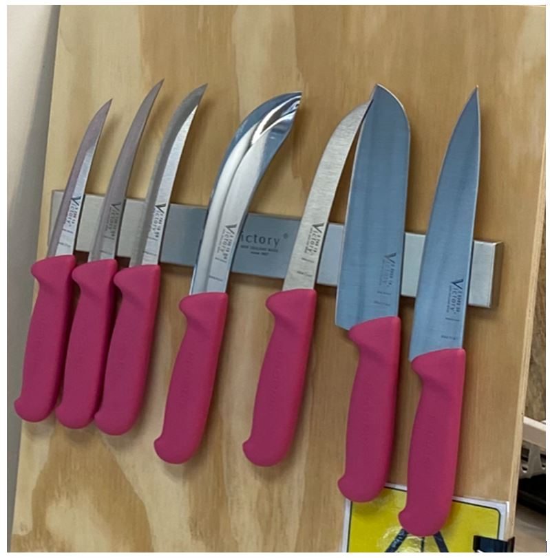 Magnetic Knife Rack, Stainless steel, L- 400mm perfect for keeping the knives off the bench and out of the draws. Holds all styles of Victory Knives and your steel. Wall mounted with hidden screws (included). Knives are not included.