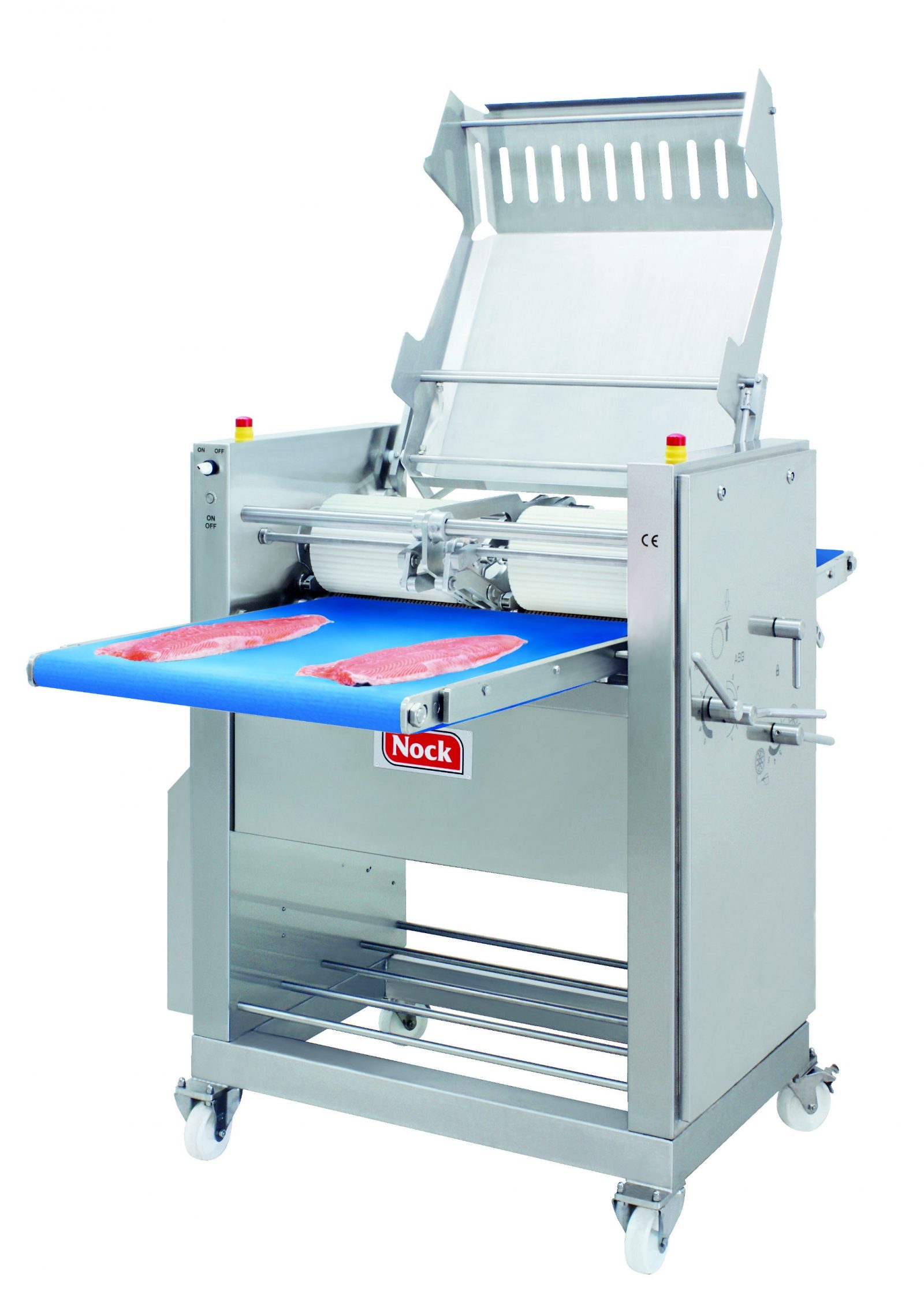 The NOCK Cortex CBF 496/7 Salmon Twin Skinner provides deeper skinning, particularly in the dark side muscle area. The roller increases pressure in the centre of the fillet, resulting in deeper skinning while keeping the sides of the fillet less affected. Optimised for fresh and smoked salmon, this double-lane skinner machine features a cutting width of 2 x 300mm and a 29 m/min cutting speed.