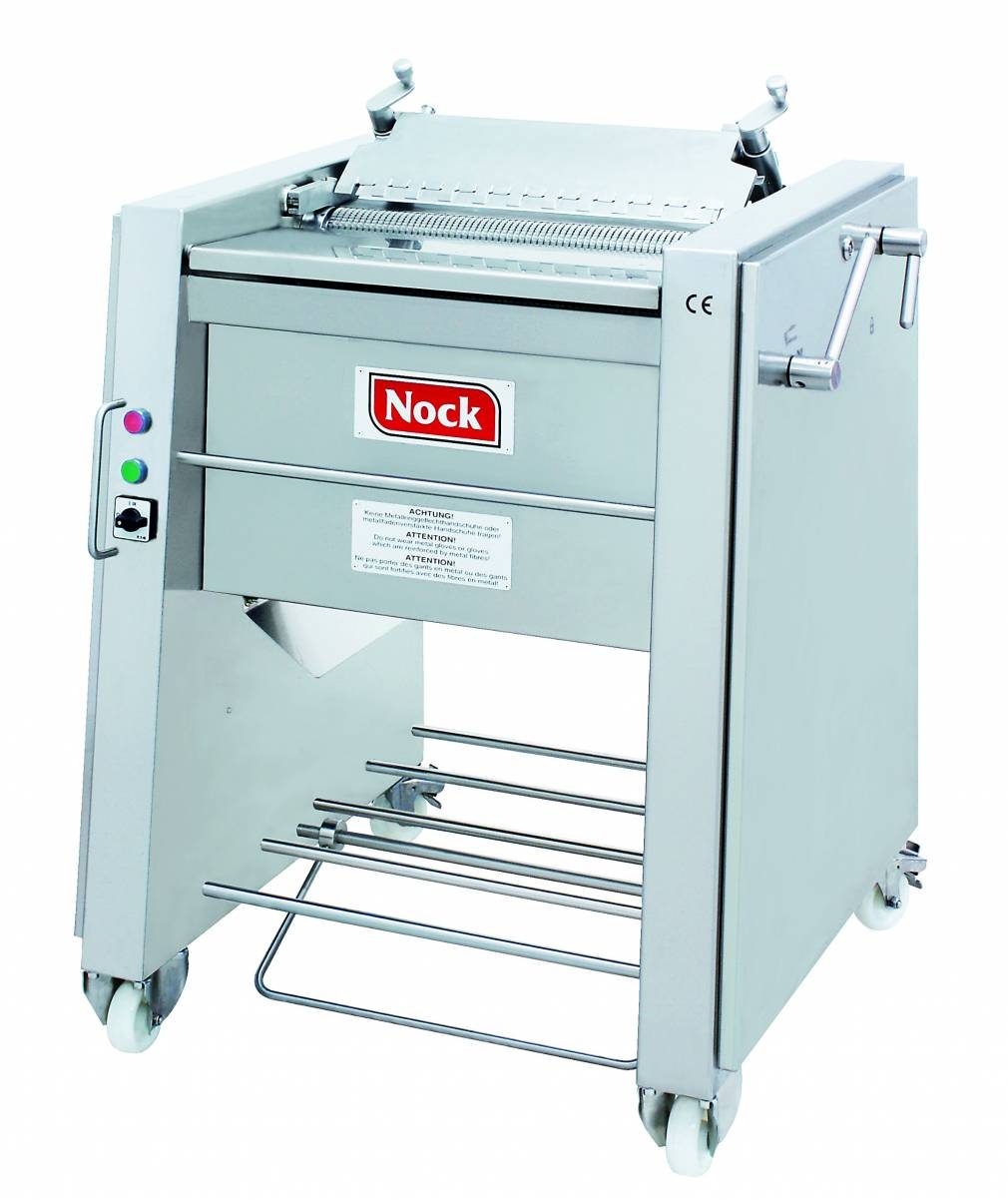 The NOCK Derinding Machine is designed for efficient rind removal and features a transport roller, blade holder, pressure device, and infeed conveyor. The blade holder is spring-suspended, automatically adjusting to the rind (skin) thickness. The pressure roller is also spring-suspended and, in most models, infinitely adjustable in height for optimal performance. This makes the machine ideal for derinding various cuts, including pork bellies, pork backs, bacon slabs, loins, hams, and more. Even freshly slaughtered meat can be processed quickly, and bacon slabs can be easily sliced for versatility.