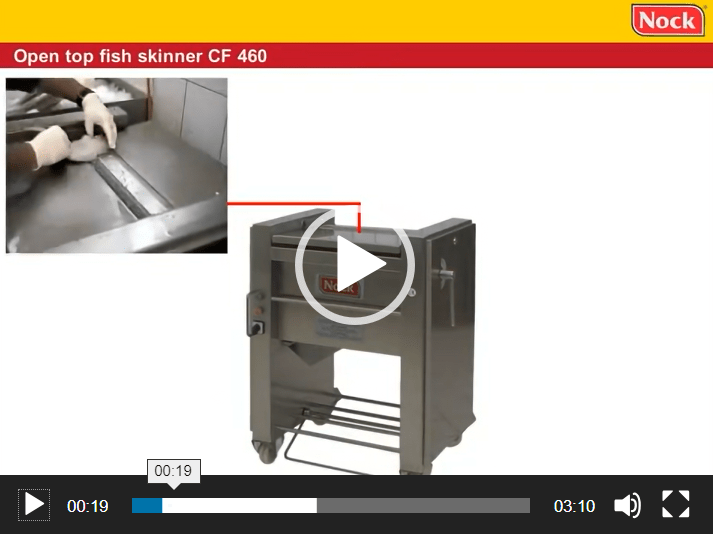 The NOCK SKINEX S 460 Fish Skinner is an advanced open-top skinning machine designed with innovative S technology to ensure low-loss skinning, particularly for fish with thin skin. With a cutting width of 430 mm and a cutting speed of 32 m/min, it offers three versatile skinning methods: thin skinning (shallow skinning) with a sharp blade for minimal waste, silver skinning (removal of silver skin) using a blunt blade, and deep skinning (restricted) with a sharp blade for thicker layers.