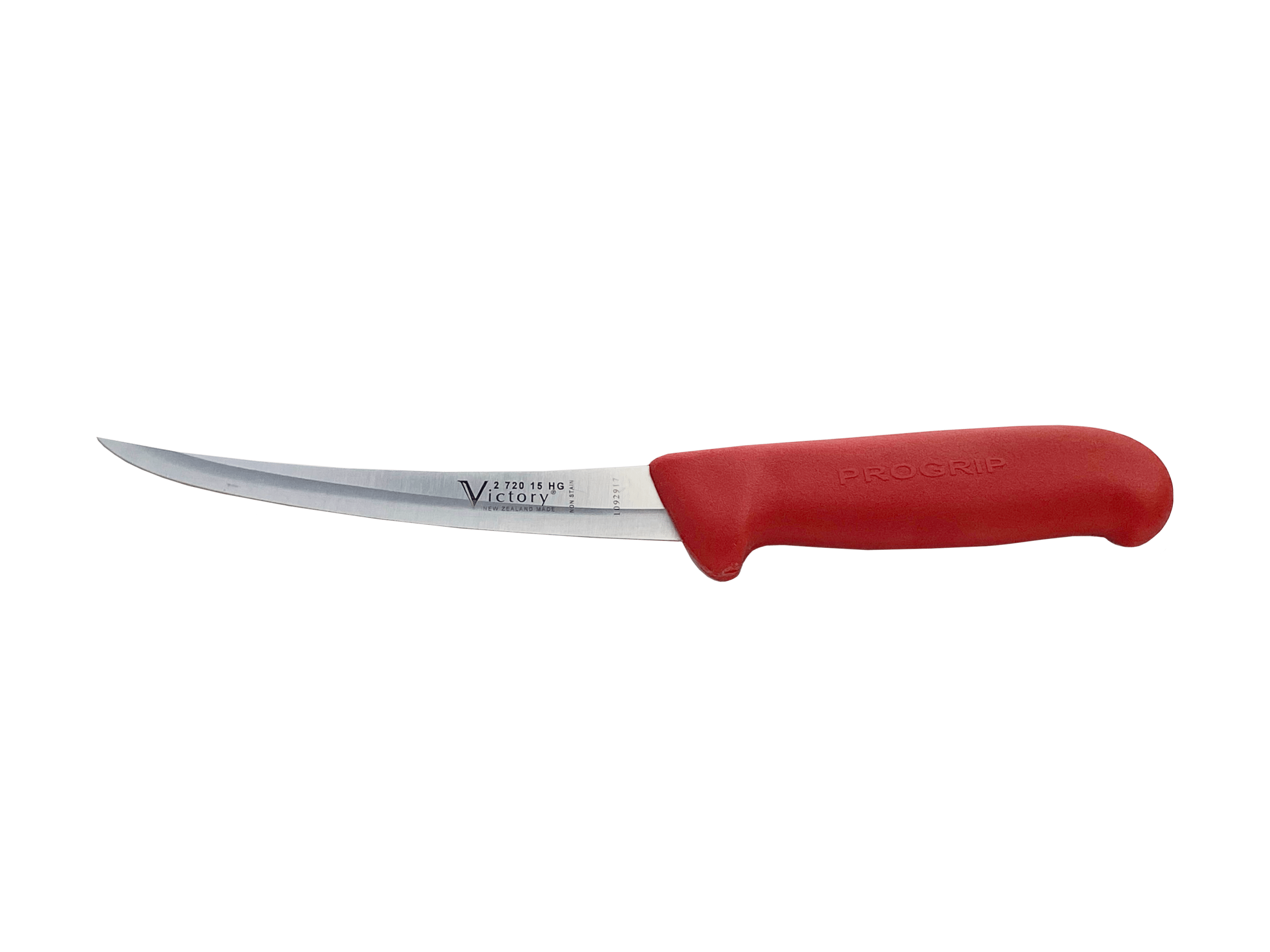 The curved blade of the boning knife is designed for easy maneuvering around bones, offering excellent control and the ideal angle for precise cuts. Its ergonomic handle, made from Red 200 Thermo-Plastic Elastomer, guarantees a comfortable, non-slip grip, making it perfect for professionals in the meat processing industry.